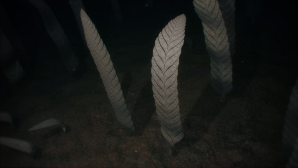 Reconstrucción digital (arriba) de varios ejemplares de Funisia dorothea. Autor: David Attenborough, copyright: Atlantic Productions. Fotografía real (abajo) de un fósil de Funisia dorothea. Autor: desconocido, copyright: Droser lab, UC Riverside.